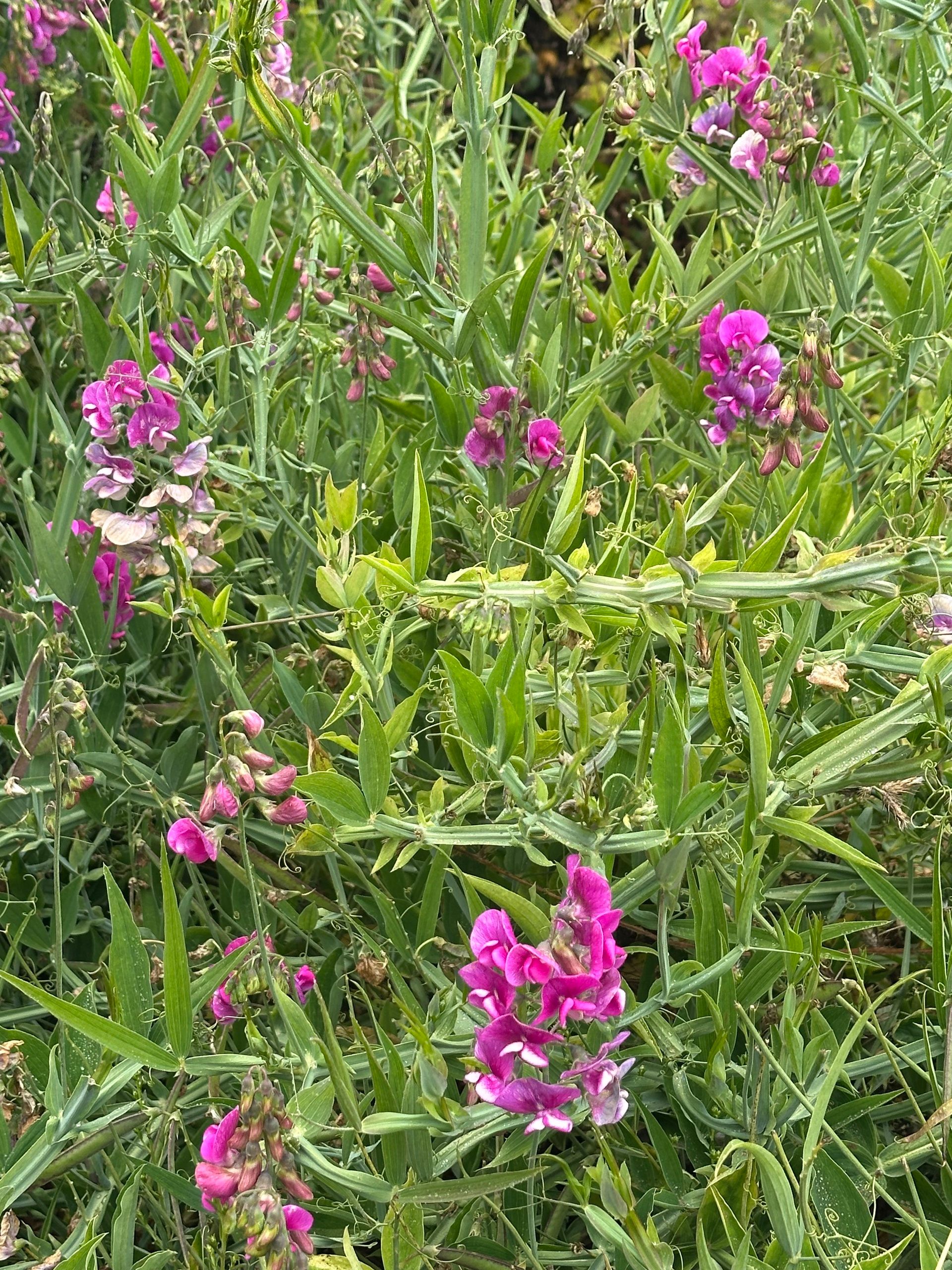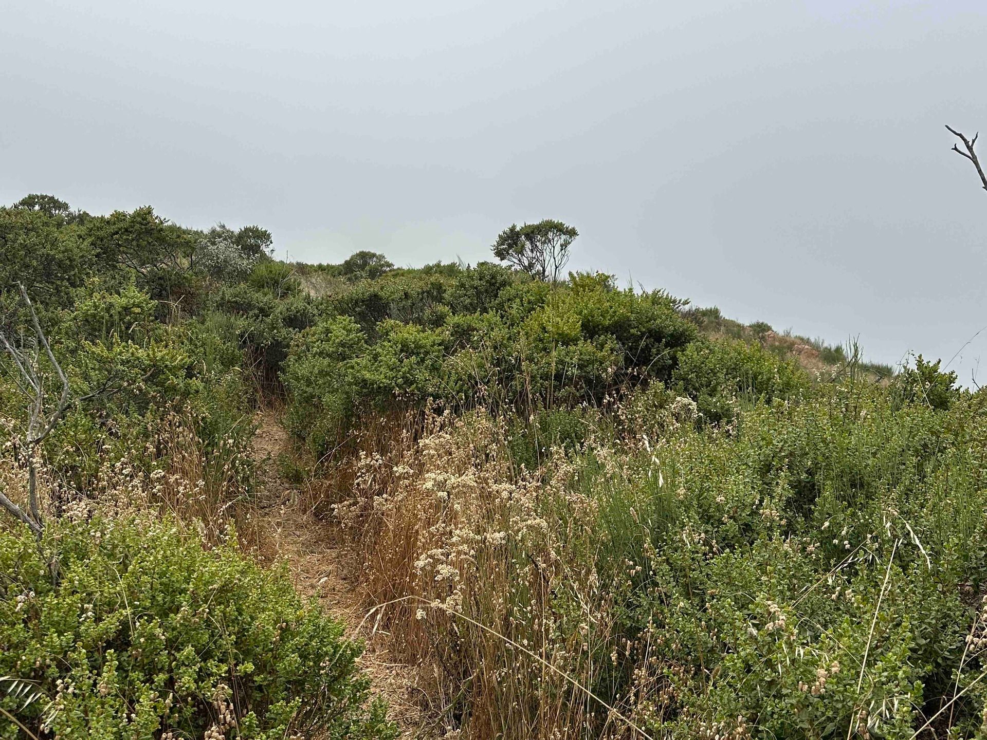 It’s an amazing landscape. This was all California coastal chaparral — that combination of shrubs and bushes and small trees ranging from shin-high to, occasionally, a good six to eight feet or more, at which height there’s a curious tunnel effect as you follow a trail down through. It’s a unique habitat, blooms abundantly throughout the spring, and stays lush into the dry summer, creating a labyrinthine world apart for small mammals, bugs, birds of all sorts, and hell-of cool predators — bobcats, coyotes, hawks, gray foxes, owls. Probably mountain lions too … not that we really saw any of these animal presences. Just evidence of their passage: Scat on the trail, a rustling sound deep in the brush …