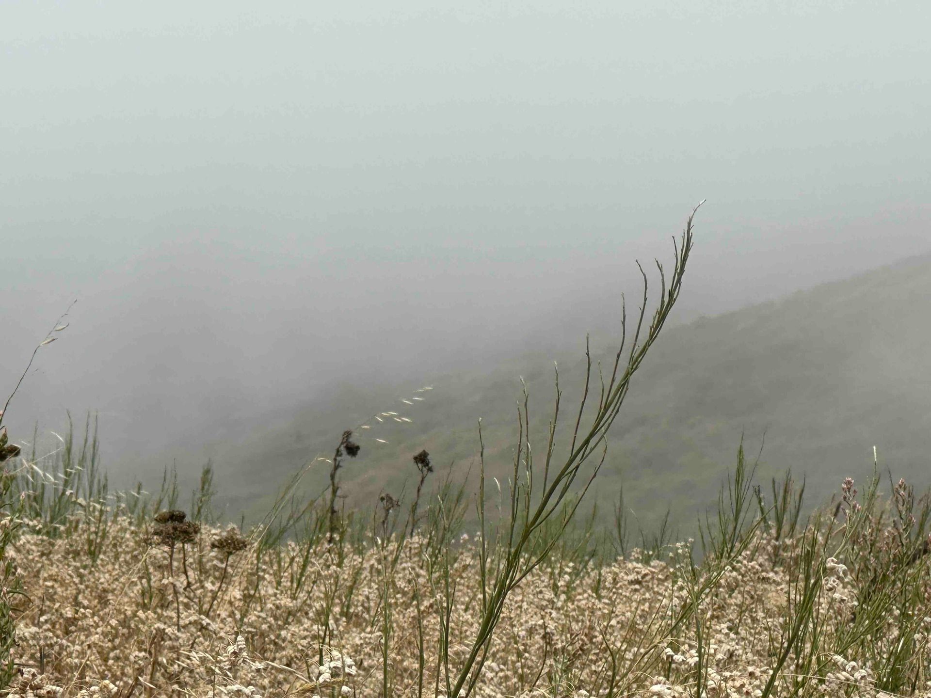 It was a gray day, windy, the sky invisible and the slopes across the various valleys and dells hidden behind big drifting fog banks. Spring was waning, but the land was still quite lush, the last flowers of the season flaring up in little spashes of color amidst the dense, mottled shades of chaparral green and dun that blanketed the steep, sweeping landscape.