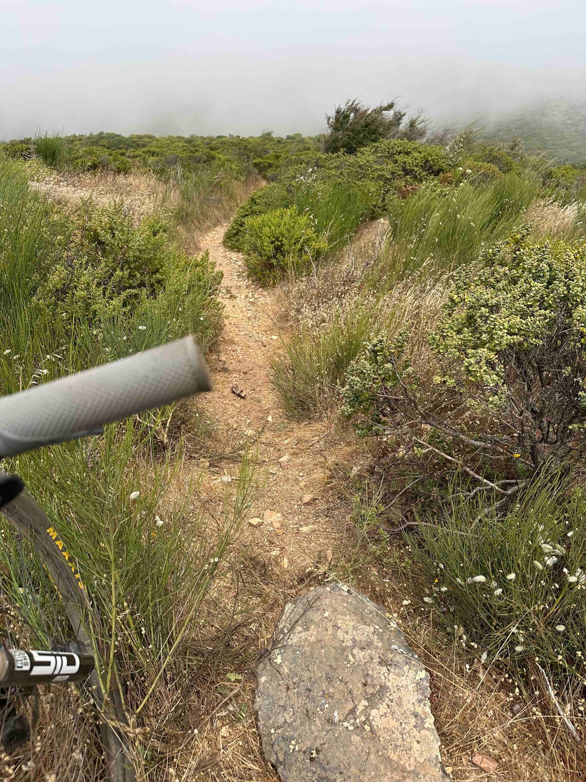 There wasn’t really a proper ridearound, however, and the landing would be a little bit technical: The trail beyond the rock was narrow and descending; hit it the wrong way and you could splorp onto your side in a small cascade of humiliation and inconvenience, wheels sideways, shoulder down, late season grass and coyote bush in your face, brambles sticking in your socks, nice worm’s-eye view of the orange, buttery-petaled California poppies trailside.